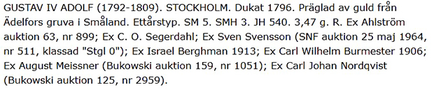 Som nr 306 såldes en Ädelforsdukat 1796 och MISAB presenterar en lång och fin provenienskedja:
