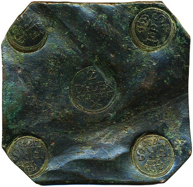 Det märkliga med den här plåten är att kronorna i de nedre hörnstämplarna är bredare än de är i de övre. Man har alltså bytt verktyg mitt under processen och detta måste vara nära nog unikt. (privat foto)