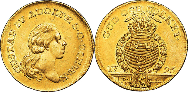 Reichmanauktionen i Halle 1924 innehöll 83 svenska objekt, däribland 65 guldmedaljer ur den så kallade ”Kungliga gåvan” som Gustav III år 1780 förärade sin kusin Peter Fredrik av Holstein-Gotorp, sedemera storhertig av Oldenburg. På auktionen fanns också 5 Ädelforsdukater: 1765, 1766, 1771, 1796 och 1801, alla inköpta av huset Oldenburg på den Scharpska auktionen i Stockholm 1851. (Källa Ahlström 63)