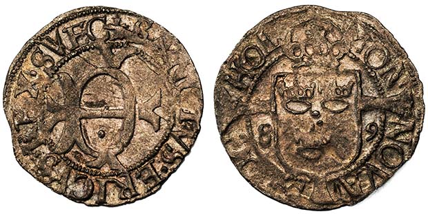 Åtsidan fotograferades tydligen uppochned vilket gör att skuggorna hamnar fel när man vänder på bilden. Ibland blir ögat lurat att tro att åtsidan är incuse. (MISABs foto)