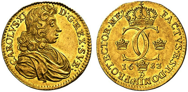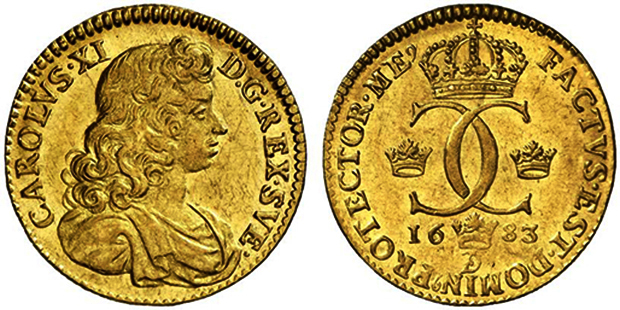 Raritetssidan – Karl XI – porträtt på dukaterna 1683 Typ 21harnesk under mantel5 kända ex40 Typ 22inget harnesk under manteln6 kända ex41